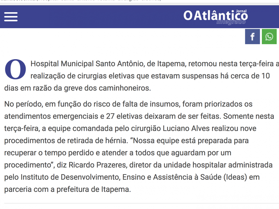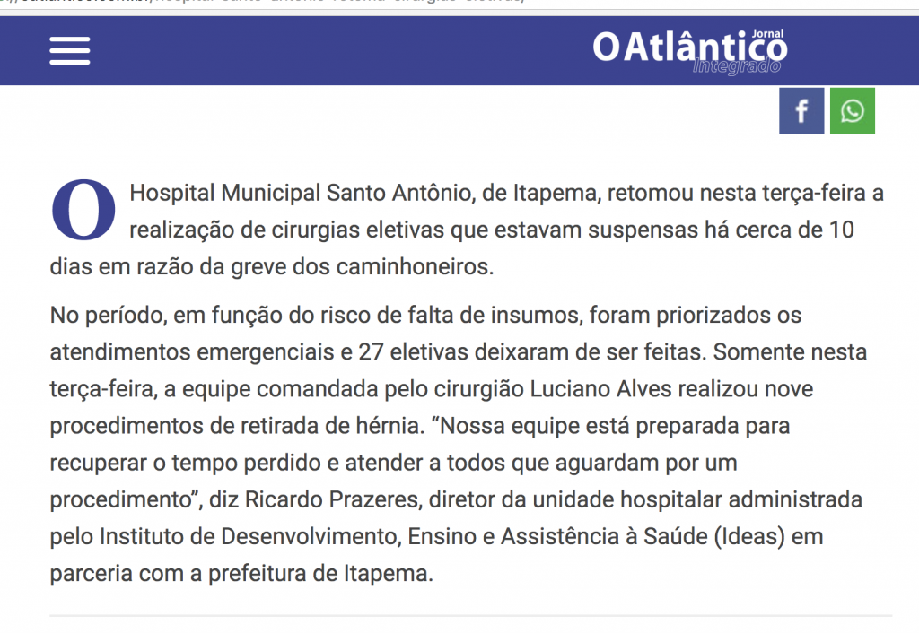 O Instituto Desenvolvimento, Ensino e Assistência a Saúde (IDEAS) assumiu, dia 11/04/2017, a gestão do Hospital Santo Antônio em Itapema, SC. Segundo o site da Prefeitura […]