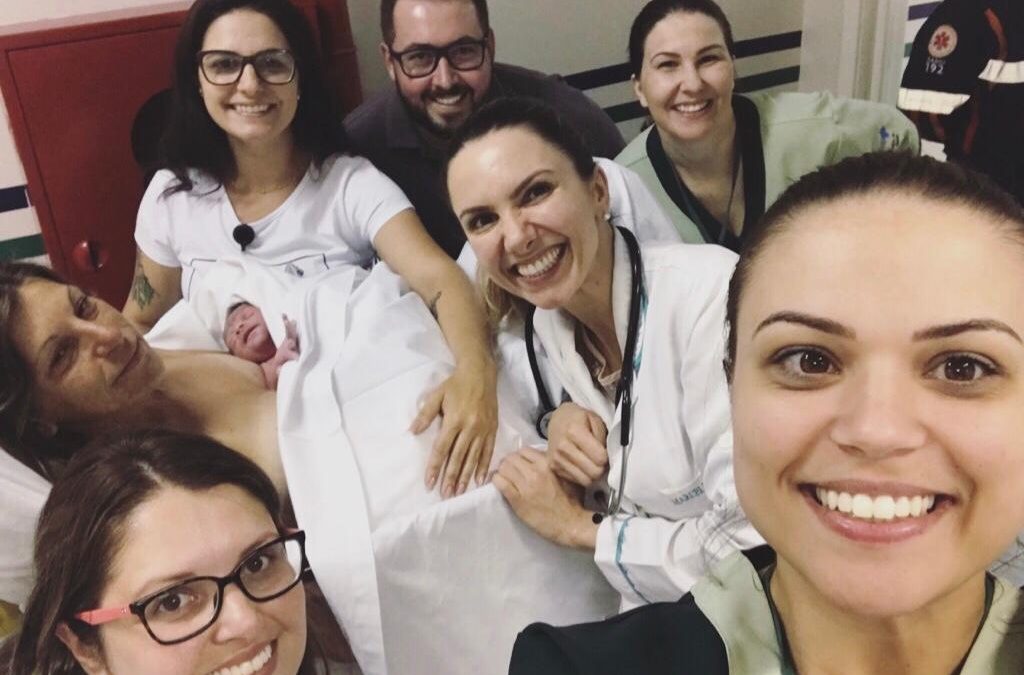 Fazem parte da equipe do primeiro parto da UPA SJ Forquilhinhas: Gerente de Enfermagem Lorraine Abdalla Alves, Franciele Farias como enfermeira assistencial, a médica Marcela Fedrizzi e a técnica de enfermagem Juliana.