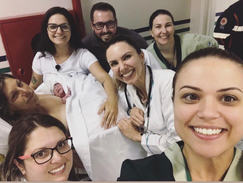 Fazem parte da equipe do primeiro parto da UPA SJ Forquilhinhas: Gerente de Enfermagem Lorraine Abdalla Alves, Franciele Farias como enfermeira assistencial, a médica Marcela Fedrizzi e a técnica de enfermagem Juliana.